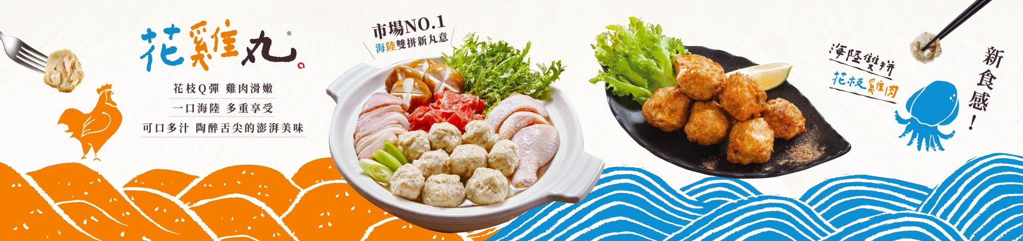 「花雞丸」品牌的創(chuàng)立起因於人員觀察臺(tái)灣家庭與火鍋餐飲市場(chǎng)丸類食用需求大增,惟原料及加工衛(wèi)生品質(zhì)一直被國(guó)人所擔(dān)憂,故決定以自身雞肉管理優(yōu)勢(shì),採(cǎi)用安全檢驗(yàn)過的雞肉與魚肉原料,經(jīng)過無(wú)數(shù)次口感與配方打樣調(diào)整,終於開發(fā)出了兼具雞肉咬感和海鮮Q彈的獨(dú)特口感、以「海陸雙拼、一次滿足」做為主打的全新創(chuàng)意丸類新品,並於2018年底推出第一款「花枝雞肉」口味丸子,成功打入眾多量販超市及餐飲市場(chǎng)!