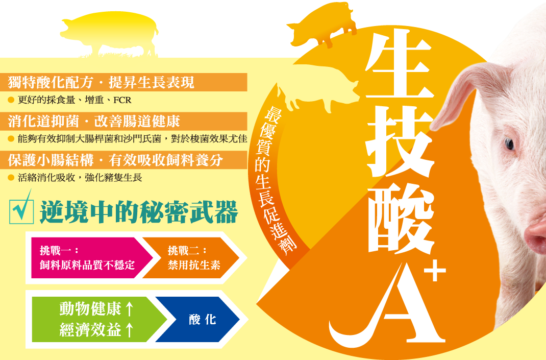 - 生技酸A+:複合有機酸,抑菌防黴、致活消化酵素、優(yōu)化腸道環(huán)境菌相