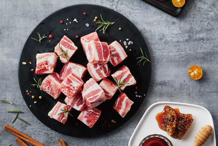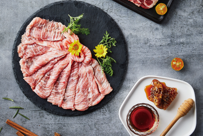 黑蜜豬為桐德黑豚二世,品種再升級的黑豚肉,為大成獨有品牌!黑蜜豬的甜,來自於獨特品種的甘甜味與多汁,一入口最純粹自然的甜味爆發(fā),同時,肌纖維細膩且柔軟,肉質鮮嫩多汁,大理石紋油花分布均勻,再加上圓潤的熟成香氣,多層氣的細膩口感讓人著迷!
